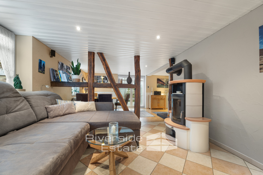 Die durchdachte Raumaufteilung erstreckt sich über zwei Vollgeschosse und überzeugt durch hochwertige Ausstattungsdetails wie Kaminöfen und eine Gasheizung (ca. 2003).