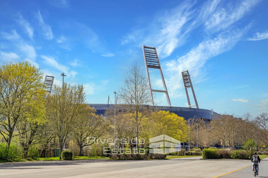 Die Wohnung befindet sich in einer der begehrtesten Wohnlagen Bremens, unweit der Weser und eingebettet in ein lebendiges, zugleich grünes Stadtumfeld. Der angrenzende Deichbereich lädt mit seinen weitläufigen Wiesen zu ausgedehnten Spaziergängen, entspannten Stunden am Wasser sowie sportlichen Aktivitäten wie Joggen oder Radfahren ein. Auch kulturell ist die Lage attraktiv, da regelmäßige Veranstaltungen in der Umgebung stattfinden und die Atmosphäre durch die Nähe zum Weserstadion besonders lebendig wirkt.